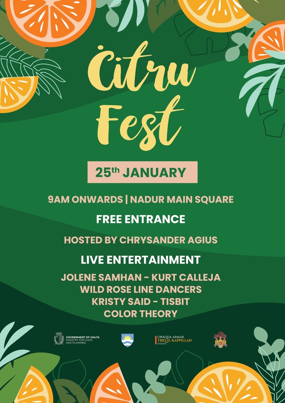 Join us for Citru Fest, a lively celebration of citrus culture that brings together vibrant flavours, great music, and a strong sense of community. Enjoy live entertainment featuring popular local artists and groups such as Jolene Samhan, Kurt Calleja, Color Theory, Wild Rose Line Dancers, The Clef House, and Kristy Said. Set against a festive backdrop inspired by fresh citrus elements, Ċitru Fest promises a fun and engaging experience for all ages, blending music, dance, and cultural appreciation in a warm and energetic atmosphere.