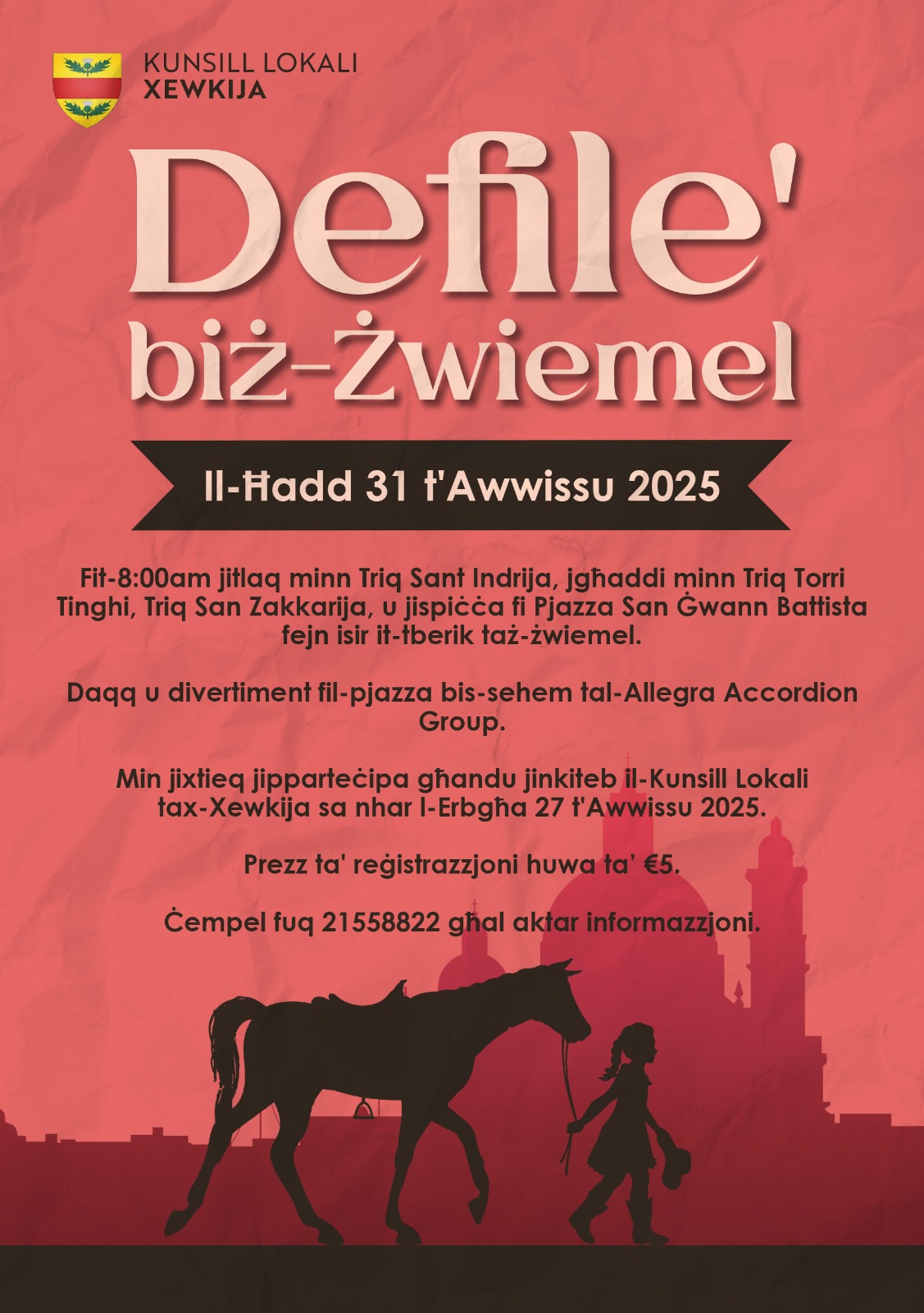 Anyone wishing to participate should register with the Xewkija Local Council by Wednesday, 27th August 2025, for a registration fee of €5. For further details, feel free to call 21558822.