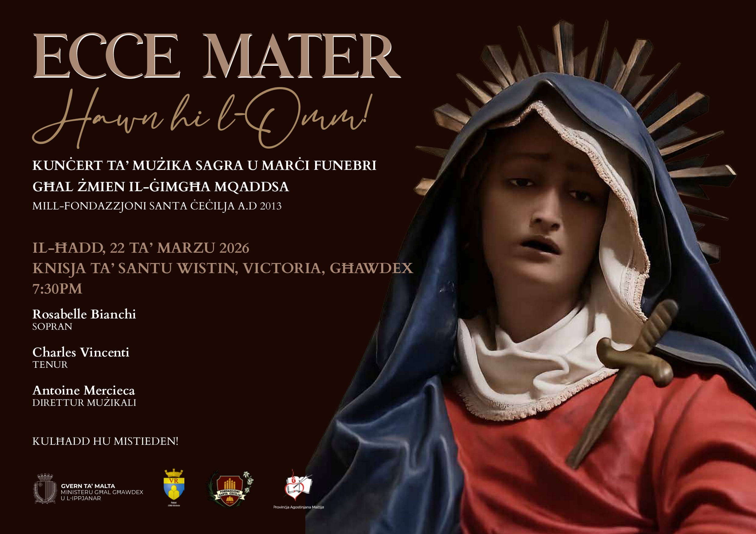 A concert centred around the theme of femininity, as reflected in the suffering of the Madonna and the contemporary struggles of women and mothers, featuring performances of funeral marches and sacred music by a band, soprano Rosabelle Bianchi, and tenor Charles Vincenti, all under the musical and artistic direction of Antoine Mercieca.