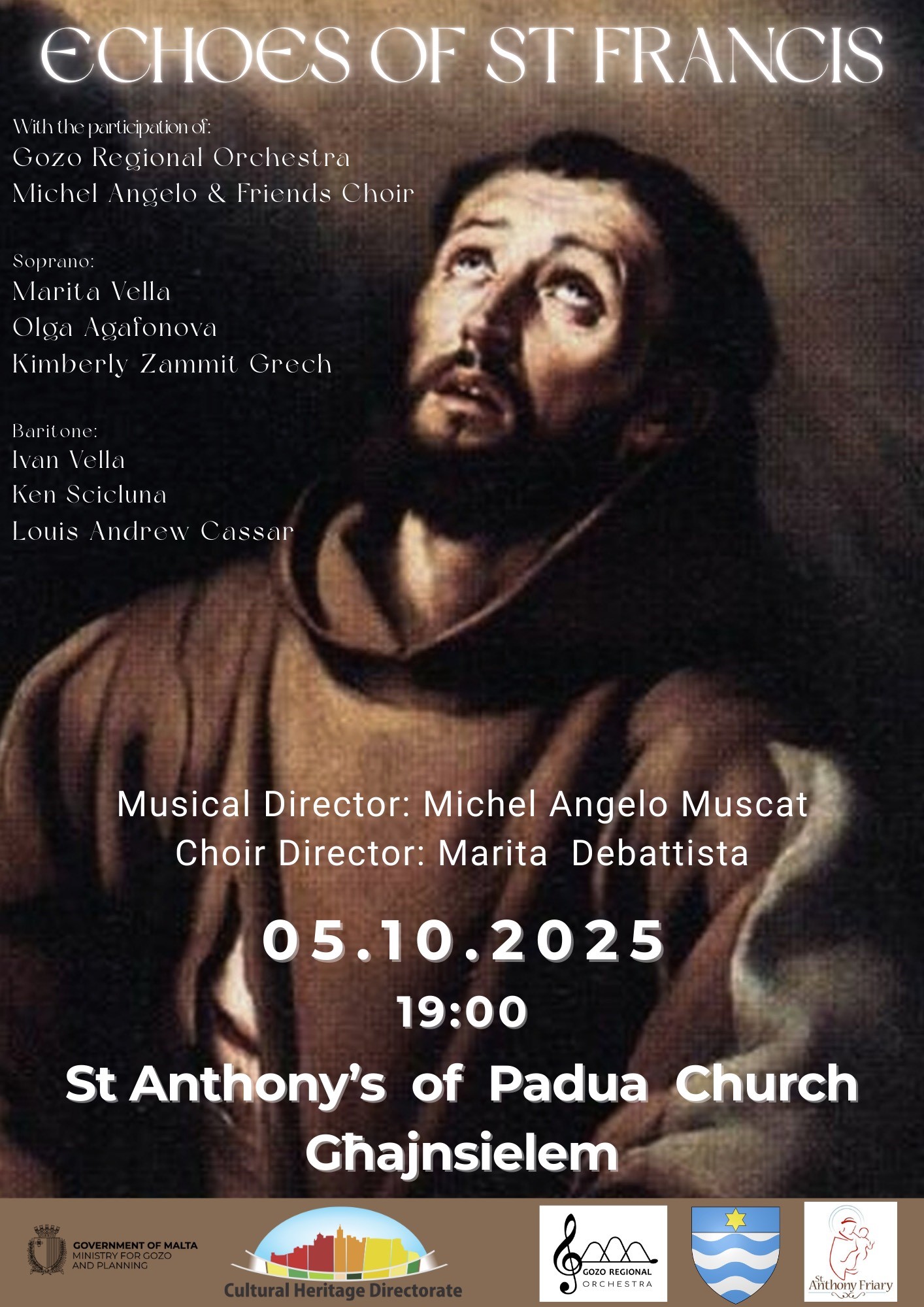 Join us for “Echoes of St Francis”, a captivating musical pilgrimage concert that will be held at St Anthony’s of Padua Church in the picturesque village of Għajnsielem. Immerse yourself in a soul-stirring evening featuring the Gozo Regional Orchestra, the Michel Angelo & Friends Choir, and talented soloists including sopranos Marita Vella, Olga Agafonova, and Kimberly Zammit Grech, along with baritones Ivan Vella, Ken Scicluna, and Louis Andrew Cassar. Under the musical direction of Michel Angelo Muscat and choir direction of Marita Debattista, this unique event promises to be a spiritual and artistic tribute to the legacy of St Francis. All are welcome to experience this extraordinary blend of faith and music.