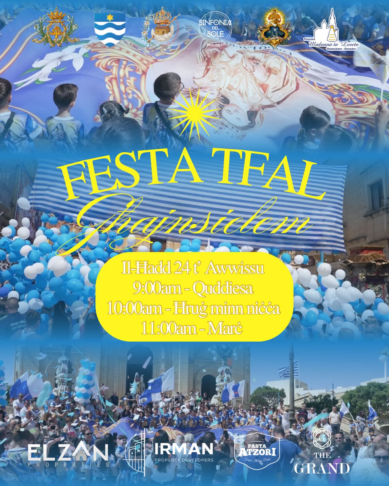 ‘Festa Tfal’ in Għajnsielem is a vibrant and religious celebration dedicated to children. The festivities begin at 9:00am with a mass followed by the traditional statue procession at 10:00am and a joyful march at 11:00am. This community-focused event promises a fun-filled and unforgettable day for everyone. Join us and be part of this celebration.