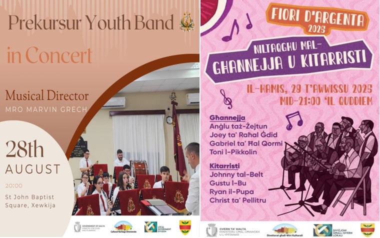 Fiori d’Argenta 2025 takes place over two evenings in Xewkija, celebrating music and tradition in honour of St John the Baptist. On Thursday, 28 August, the programme begins at 20:00 with a performance by the Prekursur Youth Band, followed at 21:00 by traditional għana singing.