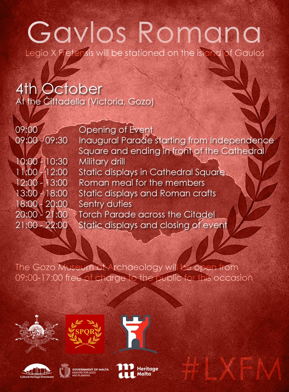 The historic Citadel in Victoria will come alive with the sights and sounds of ancient Rome during Gavlos Romana, as Legio X Fretensis is stationed on the island of Gaulos. The day will begin at 9:00 AM with the opening of the event and an inaugural parade from Independence Square to the Cathedral. A military drill follows at 10:00 am, with static displays set up in Cathedral Square until noon. Members will enjoy a traditional Roman meal from 12:00 pm to 1:00 pm, while visitors can explore Roman crafts and displays from 1:00 pm to 6:00 pm. Evening activities include sentry duties from 6:00 PM to 8:00 pm and a torch parade across the Citadel from 8:00 pm to 9:00 pm, concluding with more displays and the closing of the event from 9:00 pm to 10:00 pm. The Gozo Museum of Archaeology will also be open free of charge from 9:00 am to 5:00 pm to mark the occasion.