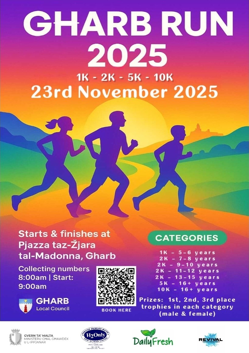 The Gharb Run 2025 is set to take place on 23rd November 2025, offering a variety of race distances including 1K, 2K, 5K, and 10K. The event starts and finishes at Visitation Square in Għarb. Participants can compete in different age-based categories, starting from 5–6 years (1K) up to 16+ years (5K and 10K). Prizes will be awarded to the 1st, 2nd, and 3rd place finishers in each category for both males and females.