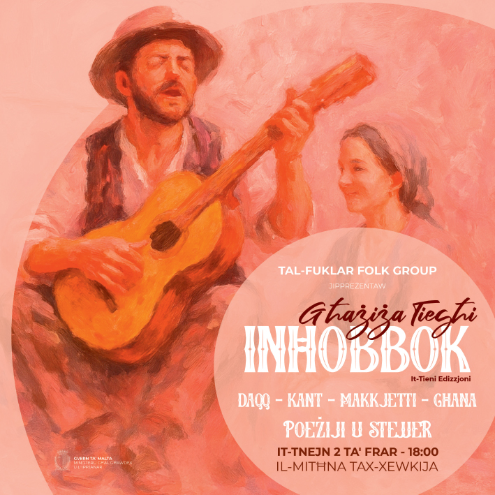 Join us for Għażiża Tiegħi Inħobbok, a warm and lively evening where tradition comes alive through heartfelt performances and a strong sense of community. This event invites you into the rich world of Maltese folklore with an enchanting mix of daqq, kant, makkjetti, għana, poetry, and storytelling.