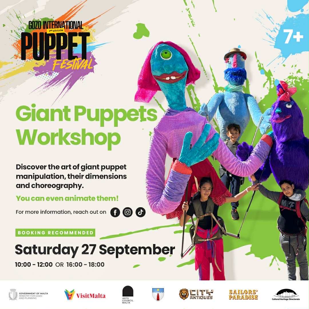 Join the Giant Puppets Workshop at the Gozo International Puppet Festival on Saturday, 27 September, and dive into the fascinating world of giant puppet manipulation! Suitable for both young audiences and adults aged 7 and up, this exciting hands-on experience will introduce you to the art of puppet choreography, movement, and understanding their impressive scale. You’ll even have the chance to animate the puppets yourself!
