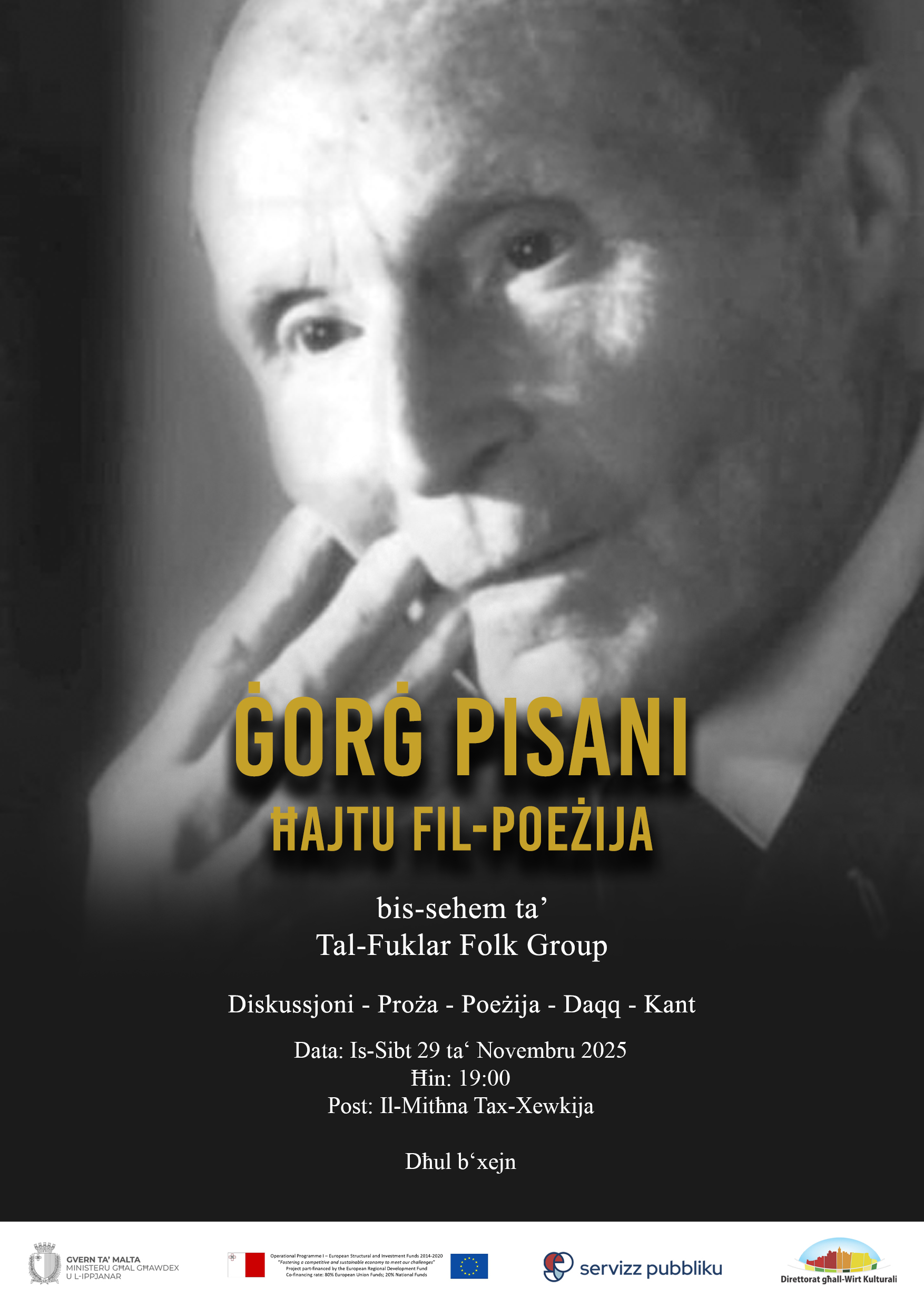 Join us for a special cultural evening celebrating the life and poetic legacy of Ġorġ Pisani, one of Malta’s treasured literary voices. This heartfelt event brings together the Tal-Fuklar Folk Group for an enriching programme of discussion, prose readings, poetry recitals, traditional music, and song. It is an opportunity to rediscover Pisani’s contribution to Maltese literature while enjoying a warm and communal atmosphere surrounded by fellow admirers of local culture. Whether you are a long-time reader of Pisani’s work or simply curious to explore the beauty of Maltese poetry, we invite you to join us for an inspiring evening dedicated to creativity, memory, and the enduring power of words.