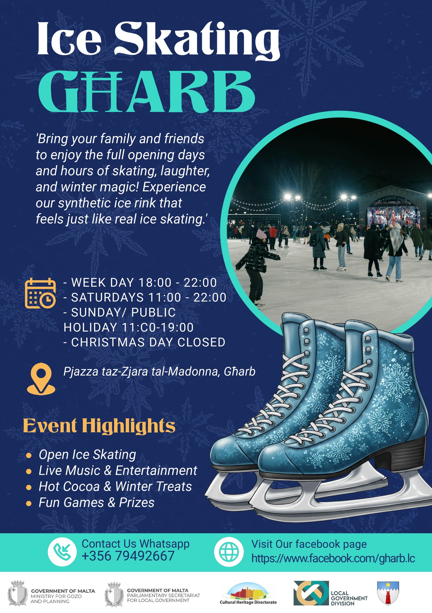 Join us in the heart of Għarb as the square transforms into a festive wonderland filled with warm lights, cheerful music, and endless fun for all ages! Enjoy daily children’s activities, exciting kids’ games, a lively bar area, and—of course—the magical Ice Skating Rink that brings the thrill and sparkle of real ice right to the village. Glide into the holiday spirit with family and friends, laugh, play, and make unforgettable winter memories. A perfect seasonal outing awaits—come join the fun!