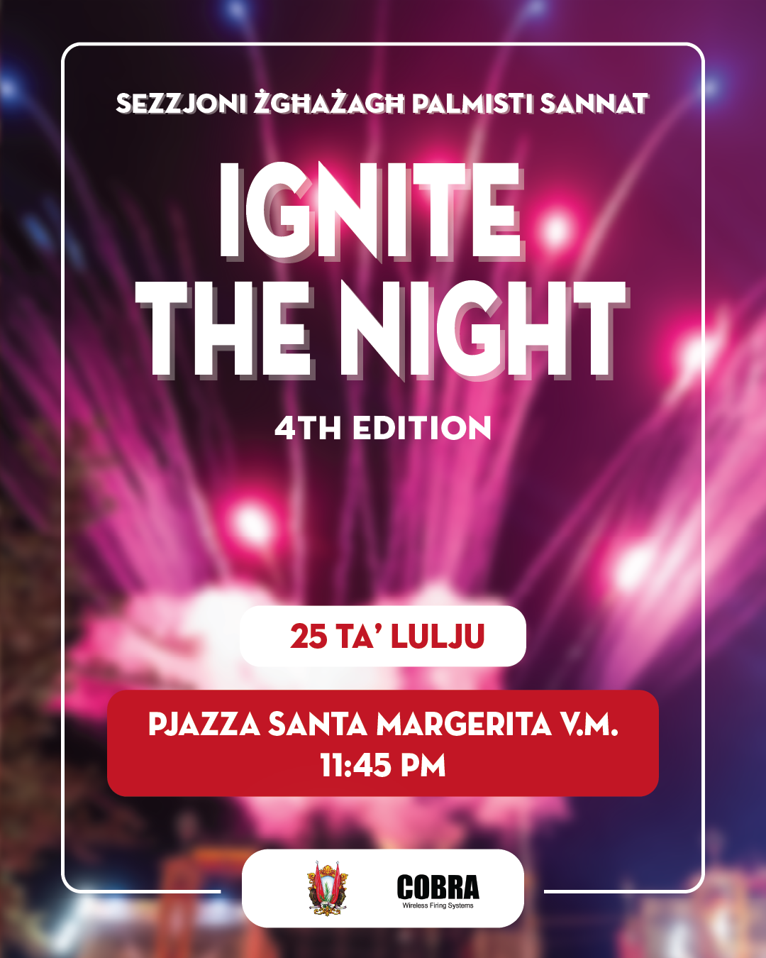 Join us for an electrifying night under the stars as Sezzjoni Żgħażagħ Palmisti Sannat proudly presents the 4th edition of “Ignite The Night” – a spectacular fireworks and music celebration lighting up the heart of Sannat!