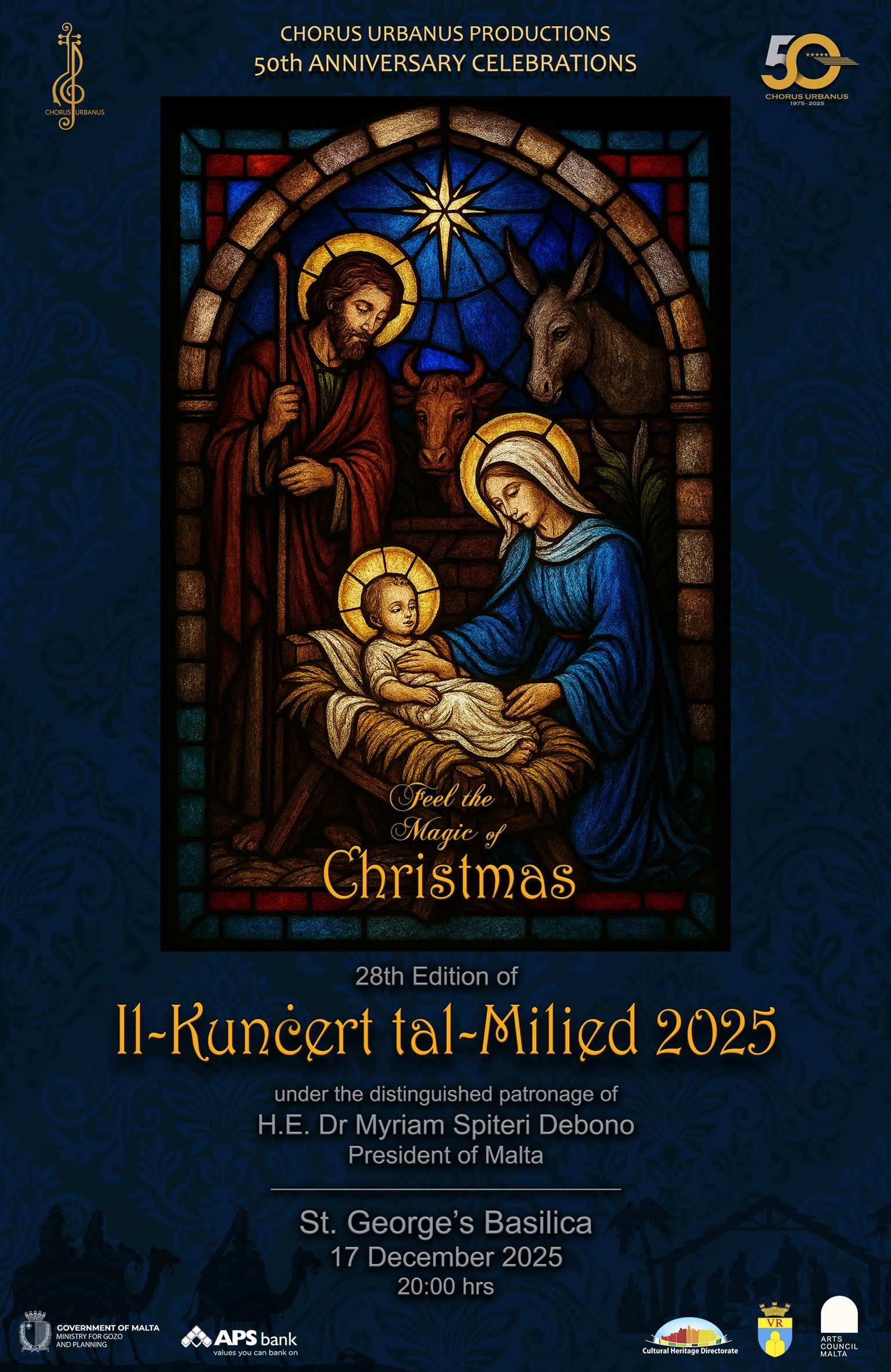 Join us for a magical evening filled with festive spirit and timeless tradition at the 28th edition of Il-Kunċert tal-Milied 2025. Celebrate the season with Chorus Urbanus Productions as part of their 50th anniversary celebrations, under the distinguished patronage of H.E. Dr. Myriam Spiteri Debono, President of Malta. Let the beauty of sacred music, choral harmonies, and the nativity story warm your heart and welcome you into the true spirit of Christmas.