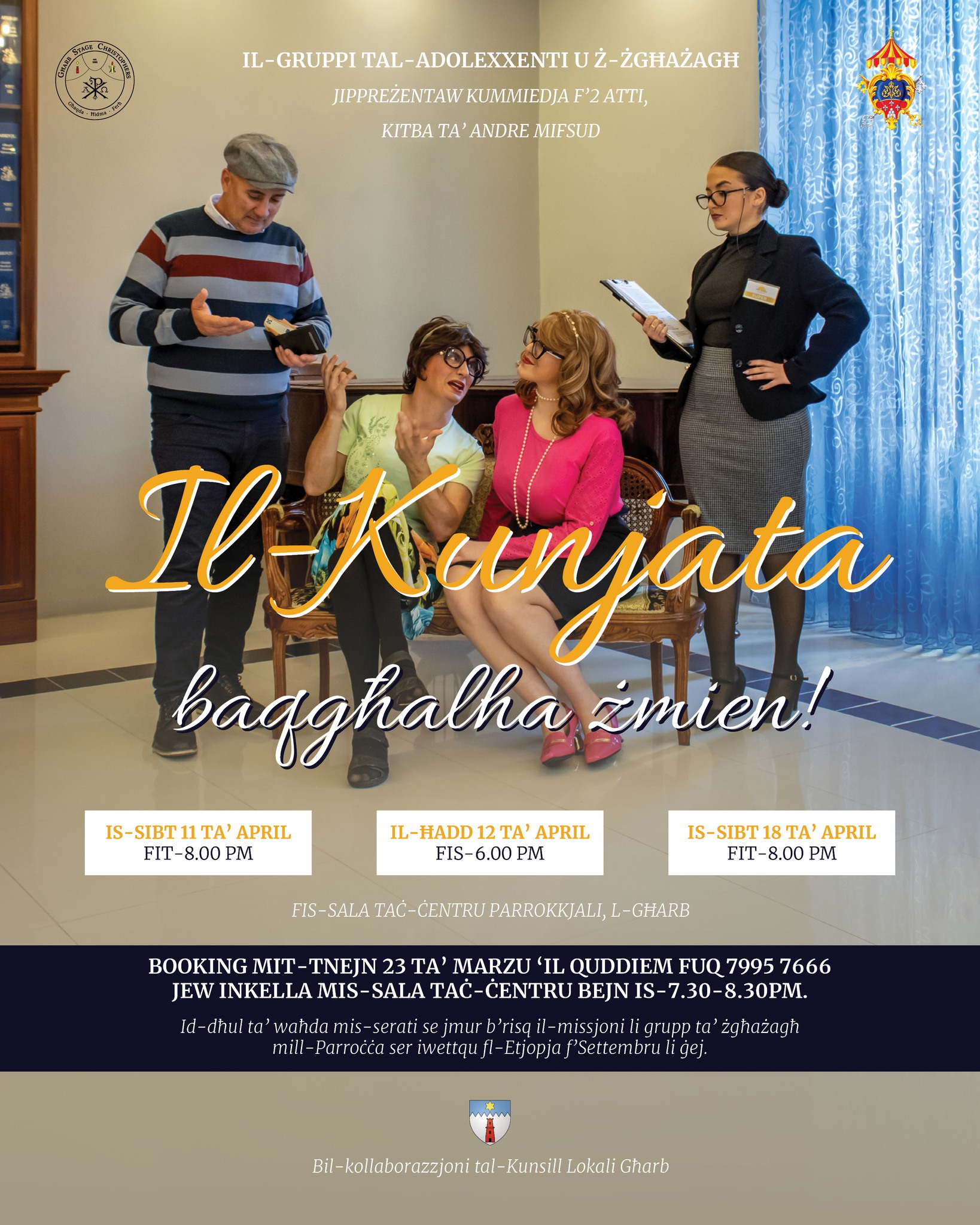 Join us for Il-Kunjata bagħqhalha żmien!, a two-act comedy written by Andre Mifsud. This light-hearted and entertaining story is full of humorous situations that will surely make you laugh while also delivering a thoughtful message.