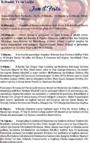 The San Ġorġ Band, together with the young followers of the Madonna statue, begins the grand procession with the statue of Our Lady of Graces, accompanied by the clergy and parish priest. Music will be provided by Societá Musicale “Sursure Melitense” of Mqabba, conducted by Mro. Mark Gauci, and guest conductor Mro. Dan George Mercieca. The procession will follow the traditional route through the village, and upon its return to the square, the hymn “Fil-Ġieh Tiegħek Marija” will be sung, followed by a blessing with the Holy Sacrament.