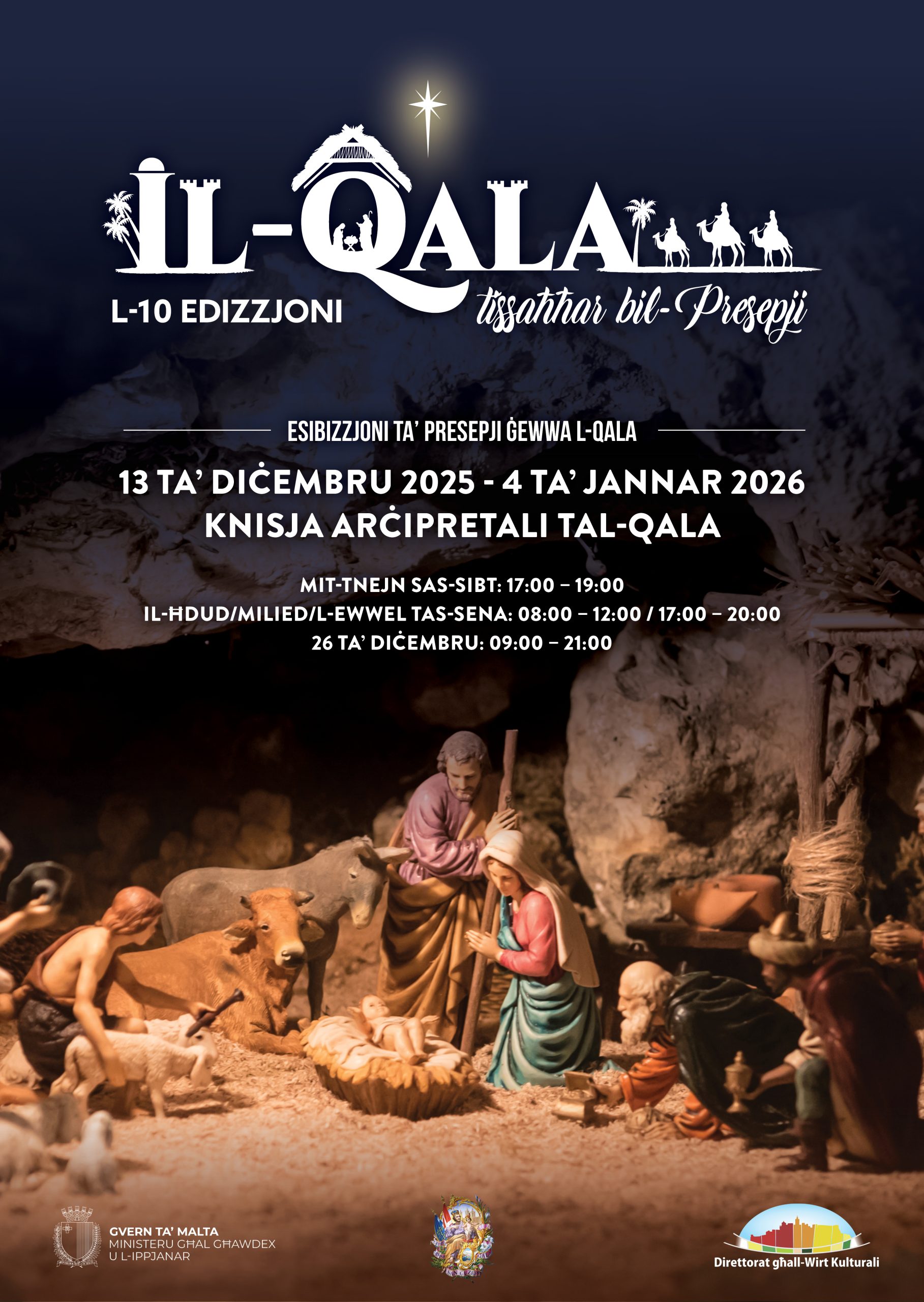 Join us for the 10th edition of Il-Qala Tissaħħar bil-Presepji, a magical nativity exhibition held in the heart of Qala! The church will be transformed into a stunning showcase of traditional Maltese cribs, celebrating the true spirit of Christmas. Whether you’re a local or a visitor, this exhibition offers a unique opportunity to experience the cultural and spiritual heritage of Gozo during the festive season. Open daily with extended hours on special days, it’s the perfect outing for families and Christmas lovers alike!