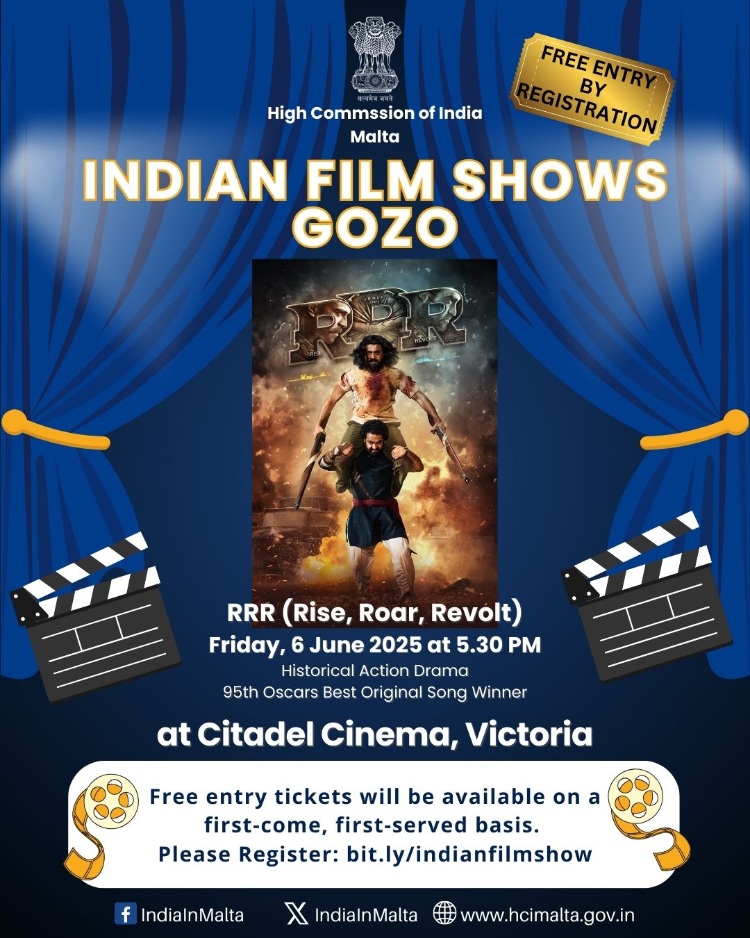 High Commission of India will be organising a special screening of an Indian film on 6 June 2025 at 5.30 PM in Citadel Cinemas, Gozo. Enjoy a unique cinematic experience showcasing the richness of Indian cinema!