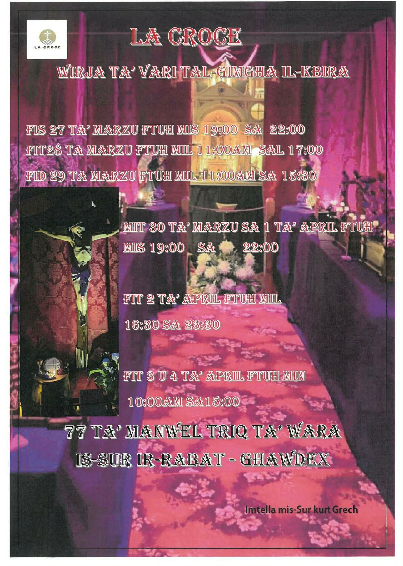 Join us this Lent season for La Croce – Wirja ta’ Vari tal-Ġimgħa l-Kbira, a sacred exhibition celebrating the devotional statues of Good Friday in a solemn and beautifully adorned setting. Visitors are invited to experience this spiritual journey during both daytime and evening opening hours. Immerse yourself in a moment of reflection, tradition, and faith as we come together to contemplate the profound meaning of the Cross during this holy season.