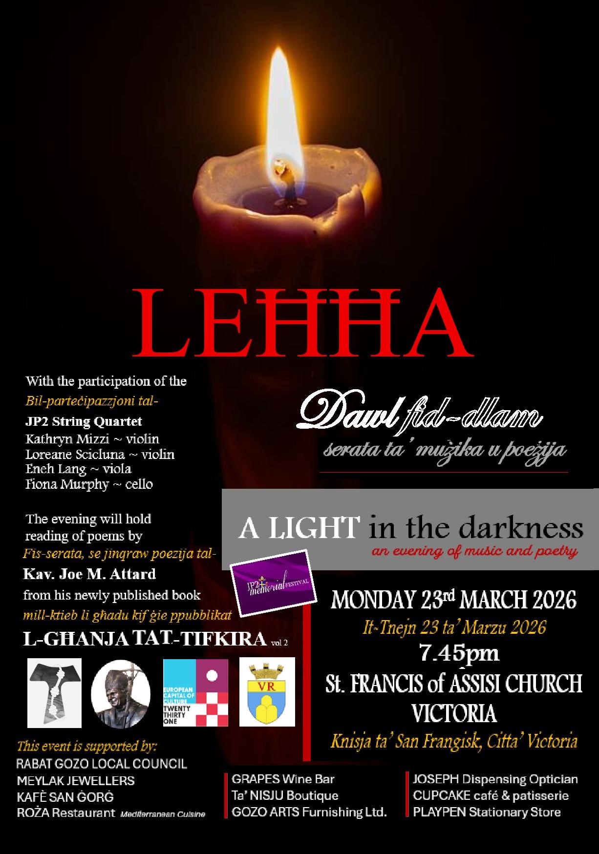 An evening of music and poetry during this preparatory time for the Holy Week “Leħħa Dawl fid-Dlam” – A light in the darkness. The evening will host the JP2 String Quartet composed of four female musicians residing in Gozo. They will be playing, Fauré, Bach, Tartini, Vivaldi, Scumann, Mozart, Schubert, Lorenc, Handel, Albinoni and Pergolesi. For this occasion Chev. Joe M. Attard will be reading some poems from his newly published poetry book “L-Għanja Tat-Tifkira”.