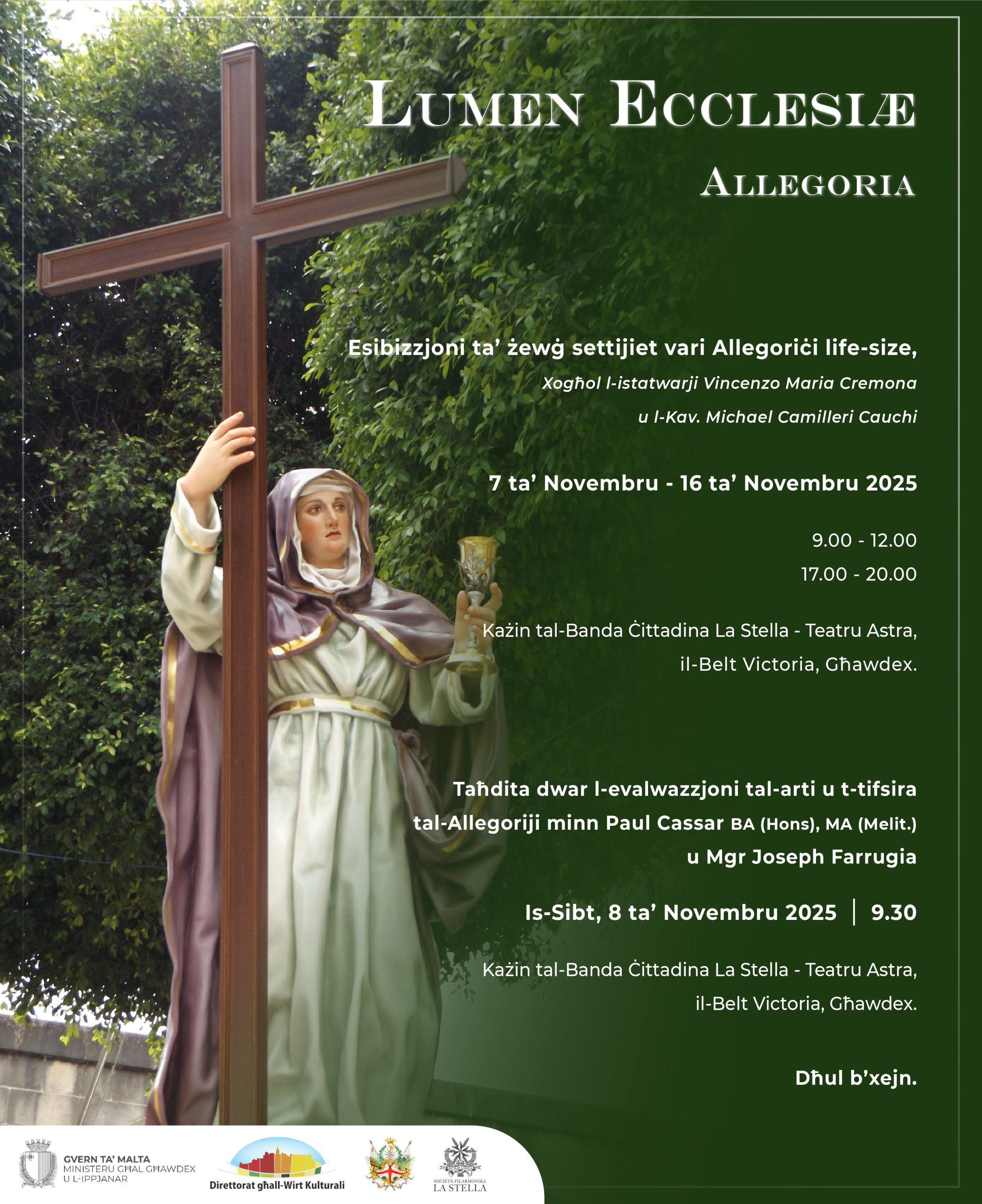 Lumen Ecclesiæ – Allegoria is a compelling exhibition that brings to light the enduring power of symbolism in sacred and cultural art. The centrepiece of the exhibition features two life-size allegorical statues crafted by the distinguished Maltese sculptors Vincenzo Maria Cremona and Chev. Michael Camilleri Cauchi. These works, rich in narrative depth and spiritual resonance, serve as visual meditations on ecclesiastical themes and the broader human condition.