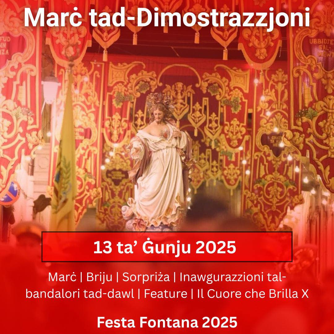 - 9:30 PM: The St. Gregory Band of Kerċem starts a march from Ta’ Mulejja Street to the front of the square, where it will accompany the procession with the statue of the Sacred Heart of Jesus through the parish streets, energetically organized by the Fontana Youth Commission.