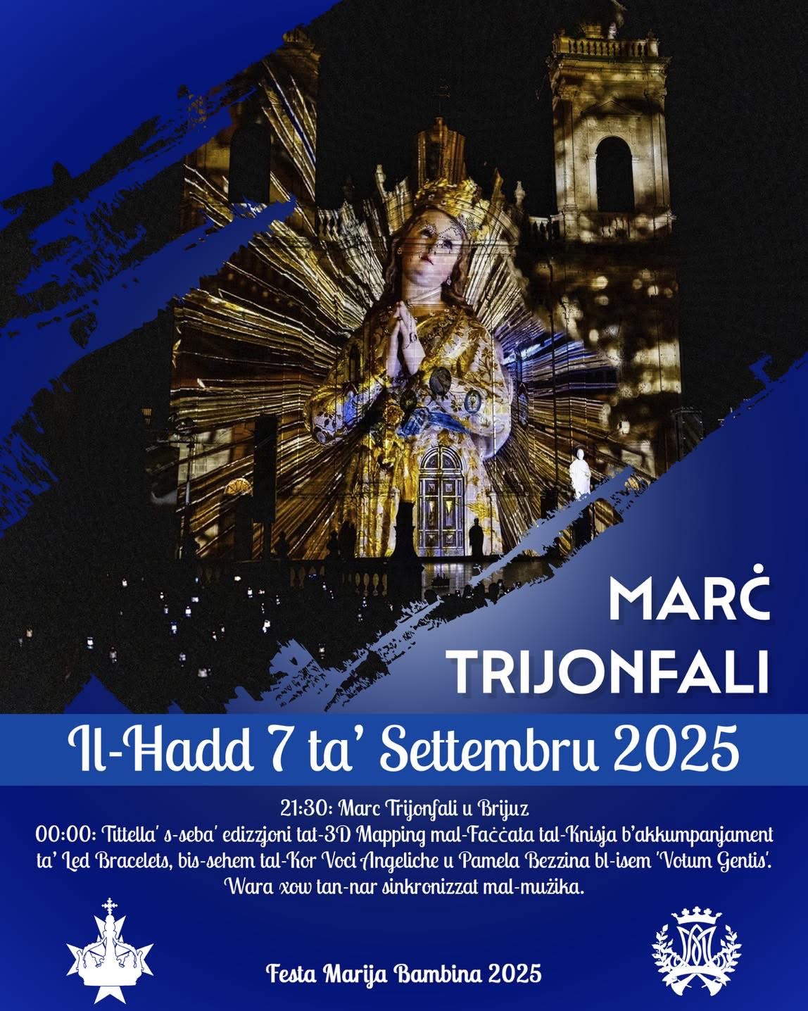 The evening begins at 9:30 PM with a lively triumphal march and festive street celebrations. Then, at midnight, witness the 7th edition of the incredible 3D mapping show, featuring the harmonious voices of Kor Voci Angeliche and a powerful live performance by Pamela Bezzina titled “Voltum Gentis.” The celebration concludes with a breathtaking fireworks display, perfectly timed to music. Join us for an unforgettable night of light, sound, and tradition!