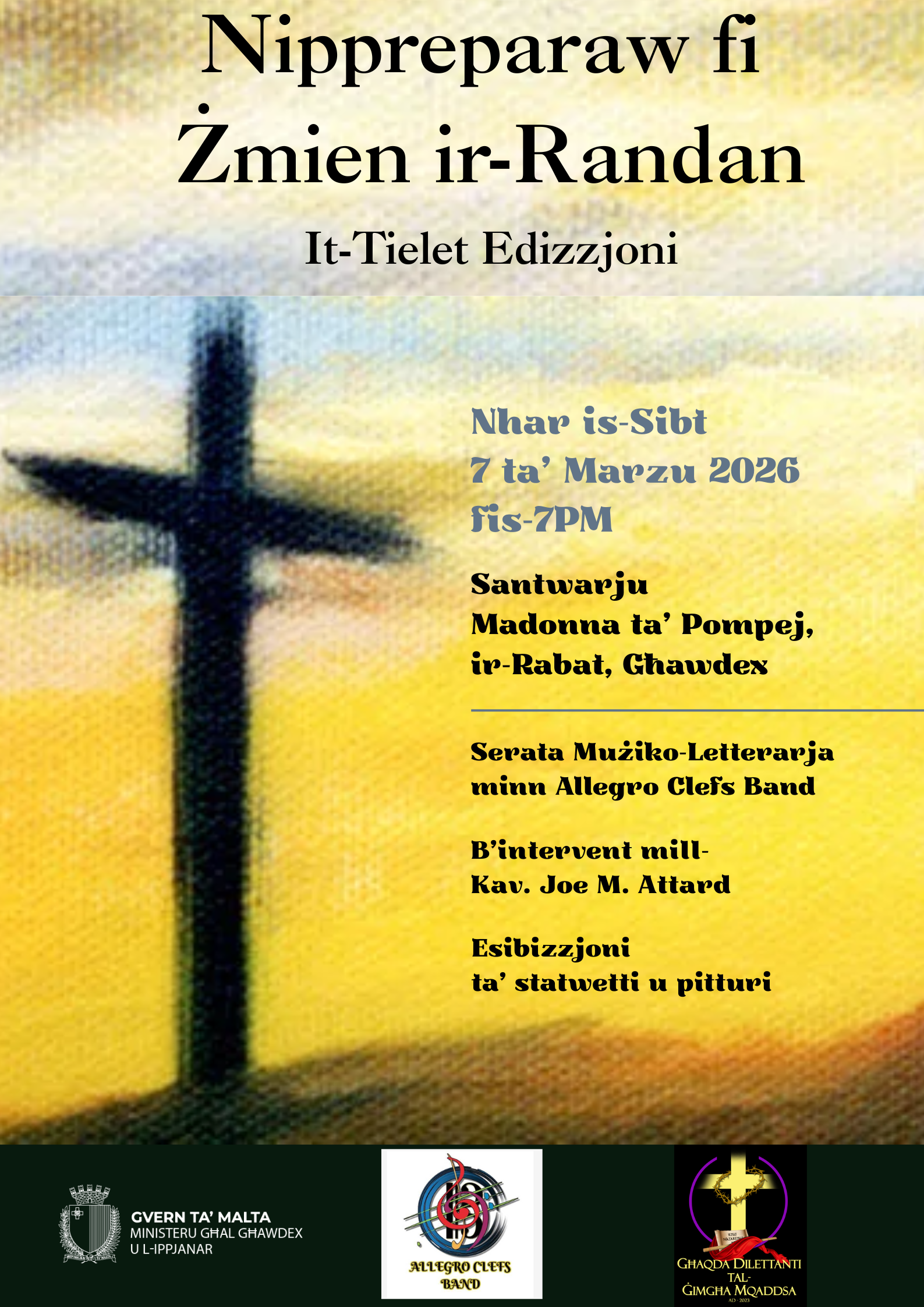 A literary feature by Chevalier Joe M. Attard reflecting on spiritual preparation for the Passion of Christ, enriched by musical excerpts from local composers and performed by the Allegro Clefs Band with young soloists. An accompanying exhibition of small statues depicting the Passion of Christ will be on display.