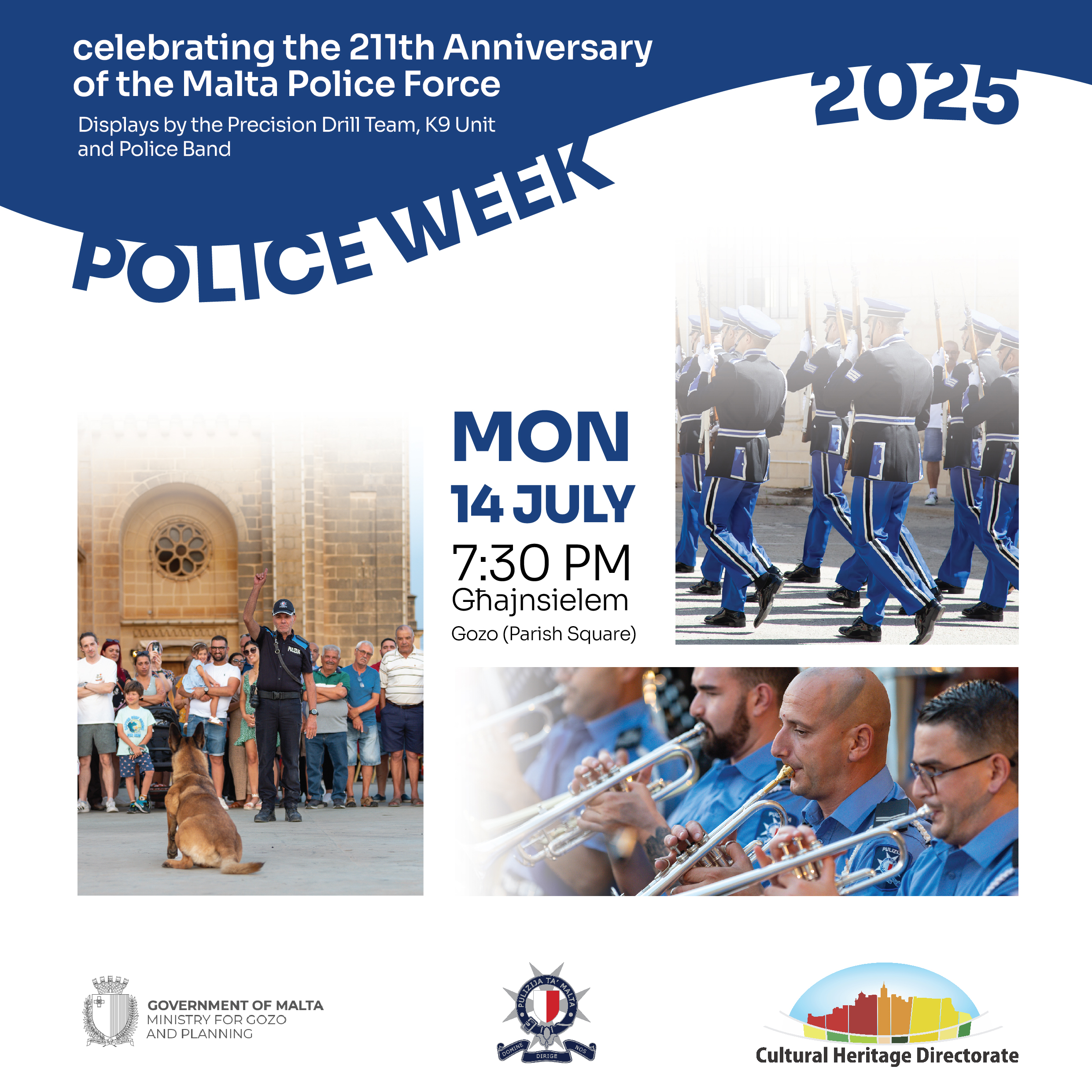 Celebrating the 211th Anniversary of the Malta Police Force.Featuring the precision drill team, K9 unit and the police bandEvent Info July 14, 2025 7:30 pm - 10:00 pmLocation: Our Lady of Loreto Square