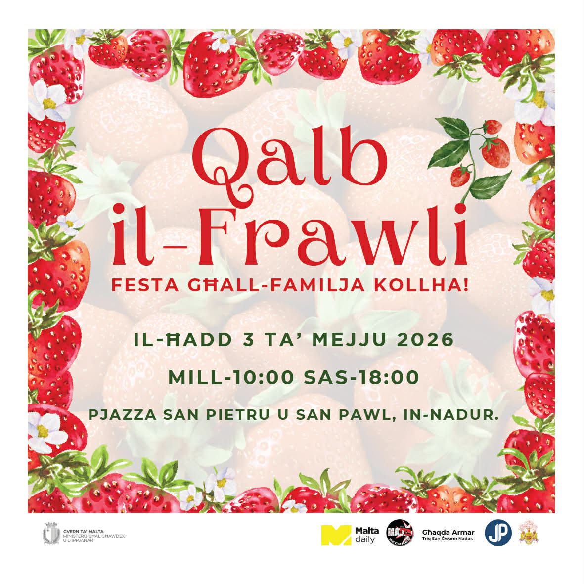 Qalb il-Frawli is a joyful festival for the whole family that celebrates strawberries, one of the most beloved fruits. During the event, visitors can enjoy a lively atmosphere filled with color, flavour, and activities for everyone. There will be a variety of strawberry-based products and treats, family-friendly entertainment, music, and experiences that bring people together to enjoy a delightful celebration dedicated to this delicious fruit. It is the perfect opportunity to gather with friends and family and enjoy the spirit of a traditional Maltese festivity.