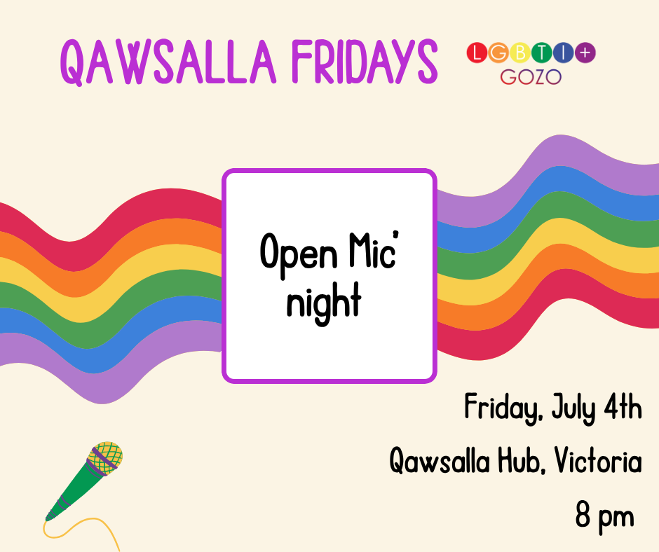 Everyone is welcome – allies too including family members, friends and supporters of Gozo’s LGBTI+ community! You do not need to me a member of the community to attend as long as you are respectful and aware that this is a safe space.