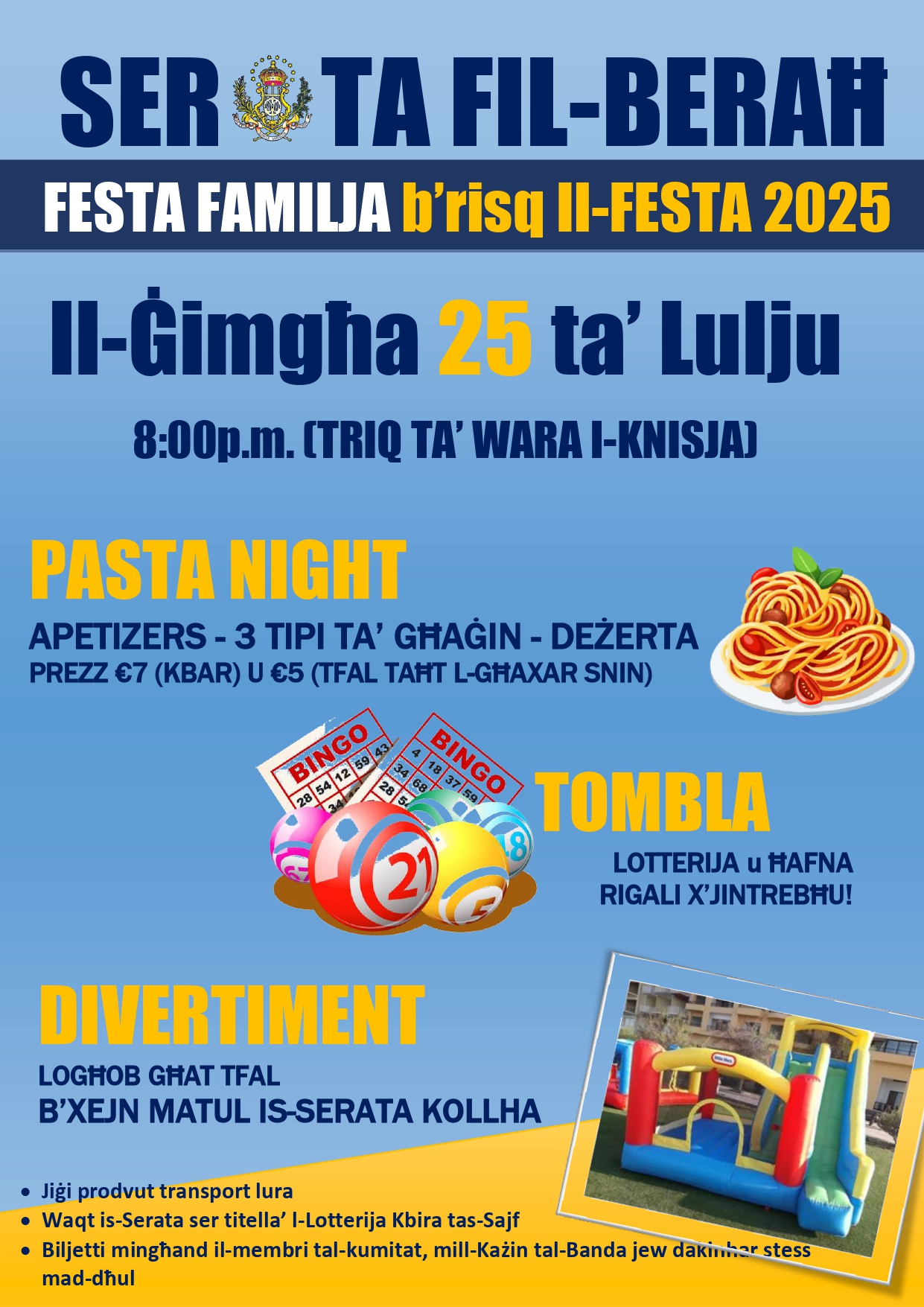 Join us on Friday, 25th July from 20:00 onwards in the street behind the church for a fun-filled night! Enjoy a big tombola with fantastic prizes to be won, a delicious pasta night and plenty of games and entertainment for the kids. Bring your friends and family for an unforgettable summer evening under the stars!