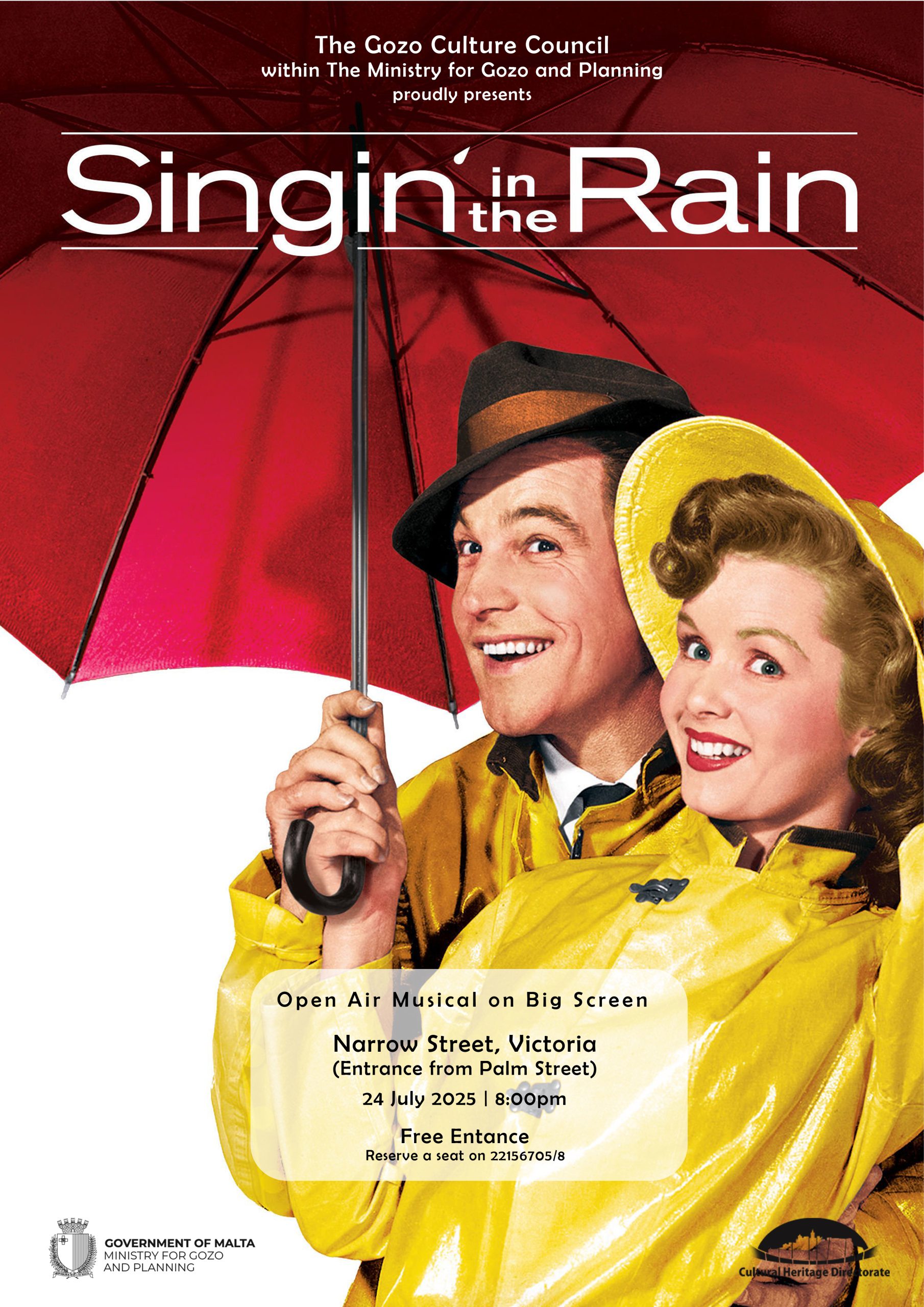 This evening, enjoy a unique open-air screening of the classic musical Singin’ in the Rain beneath the stars. Set against the historic charm of Gozo, the film’s iconic songs and dance numbers will come to life in a magical atmosphere, promising an unforgettable cinematic experience.