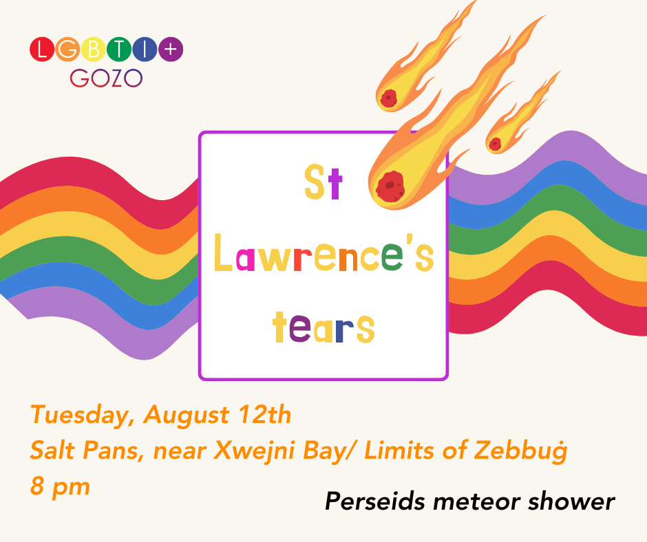 Let’s star gaze together and watch the Perseids meteor shower. Make a wish on a shooting star as you lie down in the quiet of the salt pans, limits of Zebbug where there is no light pollution. Bring a blanket and a beverage/nibbles of your choice. This is a free event open to everyone, including LGBTI+ individuals and allies. It’s a chance to connect with nature, share stories, and come together. Contact: +356 99356622
