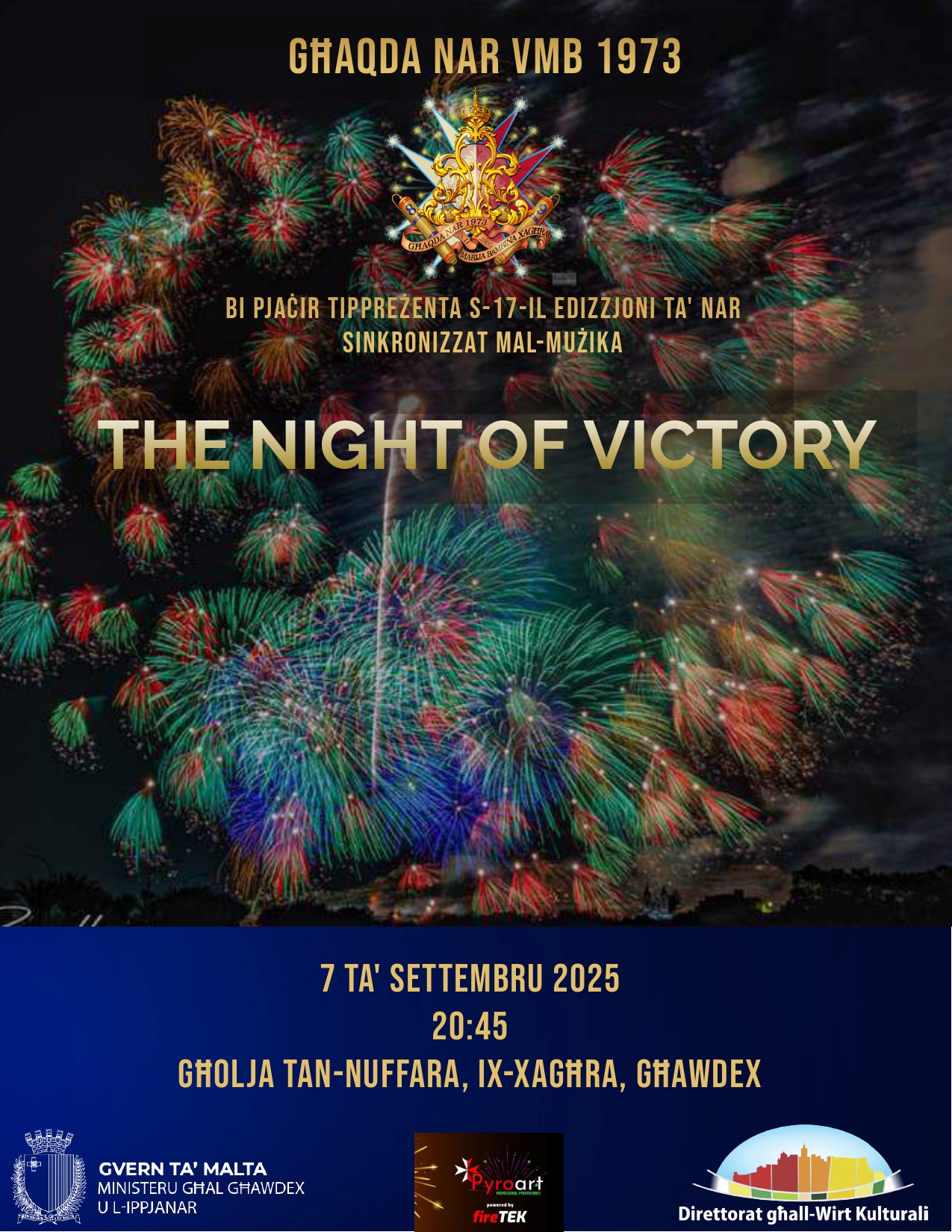 The voluntary organisation ‘Għaqda tan-Nar VMB 1973 – Marija Bambina, Xagħra’ will host the Night of Victory fireworks display to celebrate the feast of Marija Bambina. The event promotes Maltese cultural heritage, especially traditional pyrotechnics, fosters community spirit, attracts tourism, and highlights the group’s voluntary work.