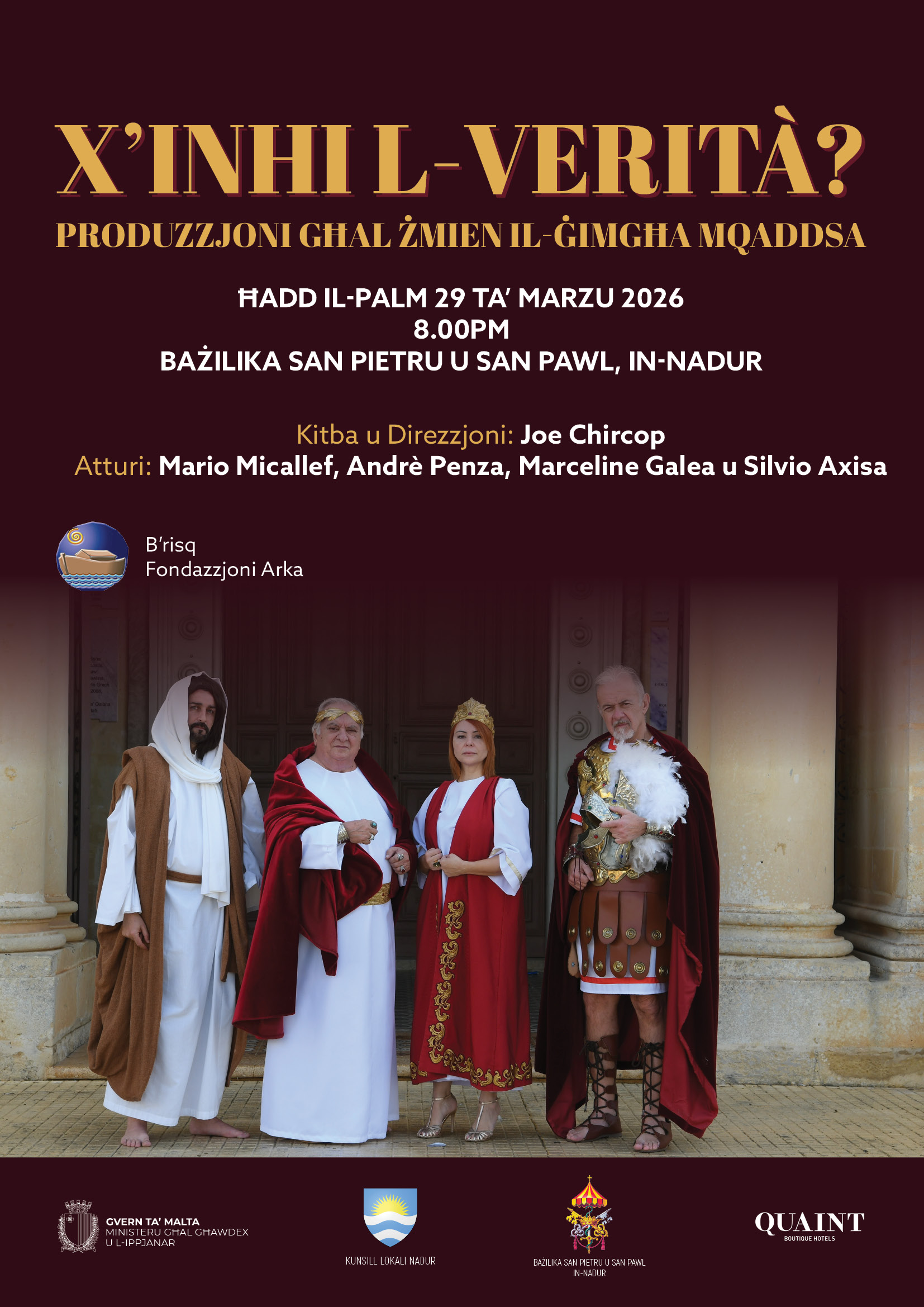 X’Inhi L-Verità? is a theatrical production that sheds a powerful light on the dramatic events of Holy Week, inviting audiences to reflect on truth, justice, and the tension between power and conscience. Written and directed by Joe Chircop and brought to life through strong performances by Mario Micallef, Andrà Penza, Marceline Galea, and Silvio Axisa, this production weaves together deep emotion, symbolism, and compelling storytelling to deliver a spiritual and human message that resonates long after the performance ends.